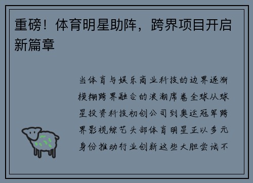吴昌泽提前1年回归,展望着不同的体育领域。整篇文章围绕一个人物、一个项目和一场新主题展开。通过对吴昌泽在不同领域的展望,探讨他在体育界的影响和未来发展。 1、吴昌泽的个人成就 吴昌泽是一位备受瞩目的...